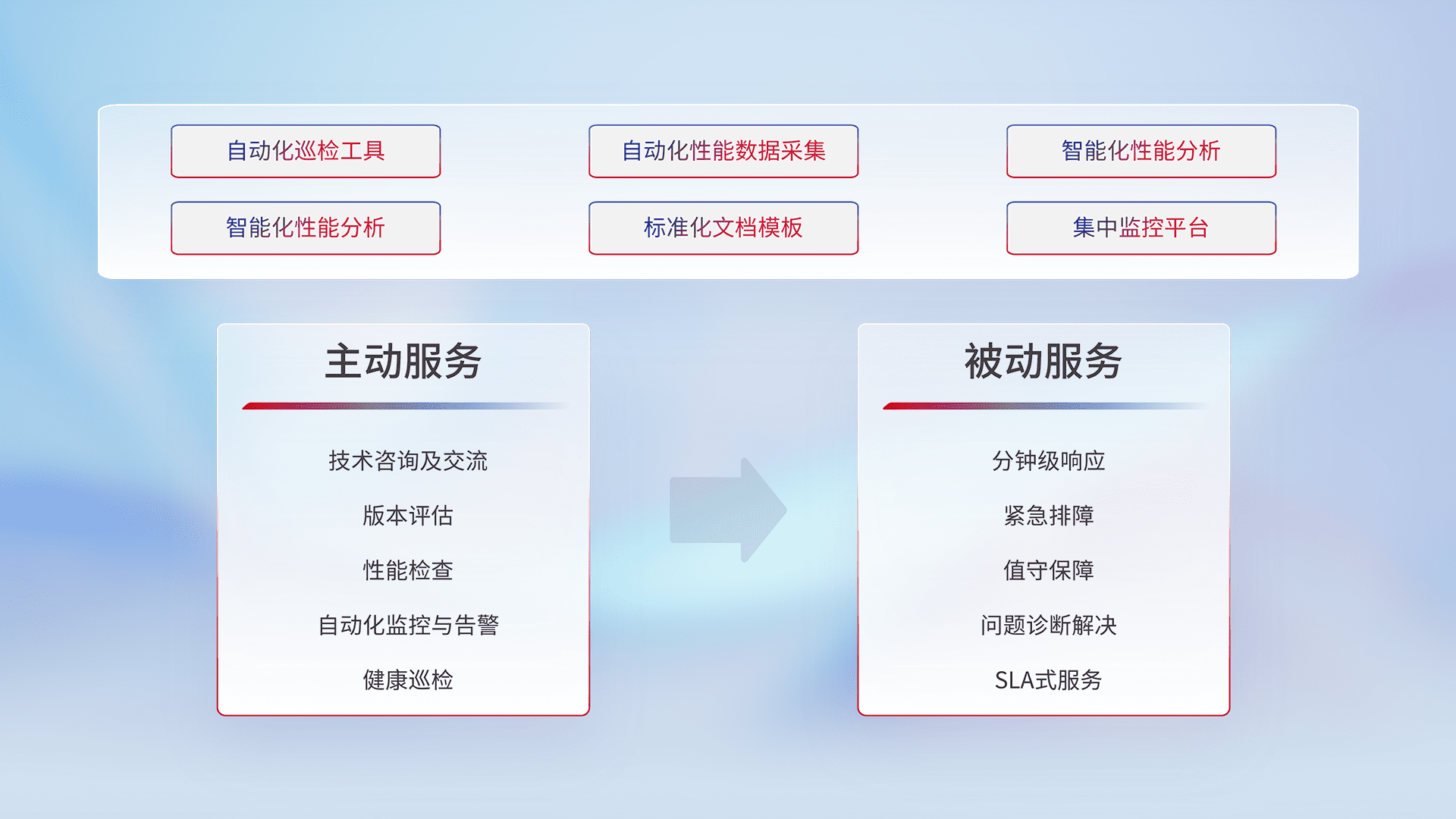 智能化工具和标准化文档,,,保障服务质量,,提供主动服务(包含技术咨询、、、版本评估、、、性能检查、、自动化监控与告警、、、健康巡检)和被动服务包含(分钟级响应、、、紧急排障、、、值守保障、、、问题诊断解决、、SLA服务)。。